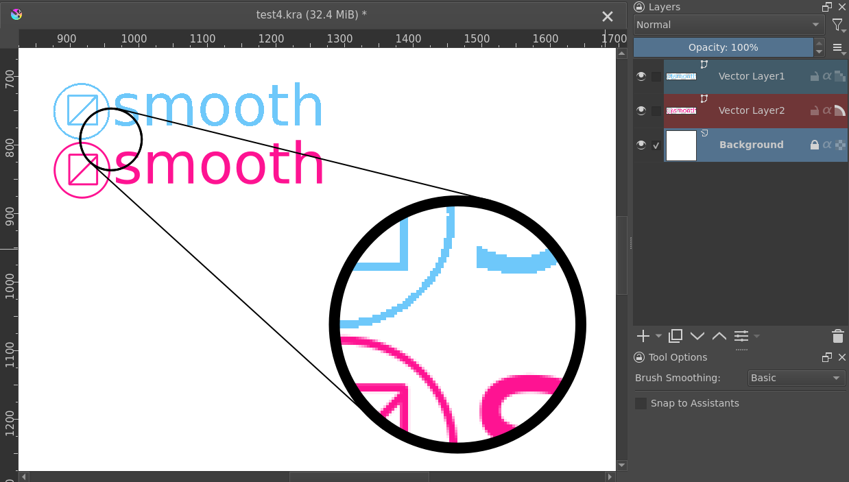 On blue vector shapes, you can see aliased pixels in magnified view - In the Layers docker the vector layer icon
