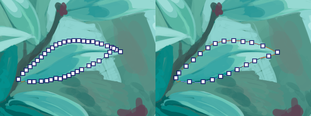 + arrastar para posicionar pontos automaticamente, este valor determina o intervalo médio entre duas âncoras. Valores baixos proporcionam alta precisão ao posicionar muitos nós, mas também é mais difícil de editar posteriormente. Os pixels estão nas dimensões da tela e não nas dimensões da imagem, o que significa que são afetados pelo zoom.