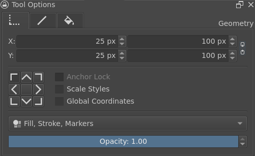 A opacidade geral, ou transparência, do objeto. A opacidade do traço e do preenchimento será explicada nas próximas duas seções.
