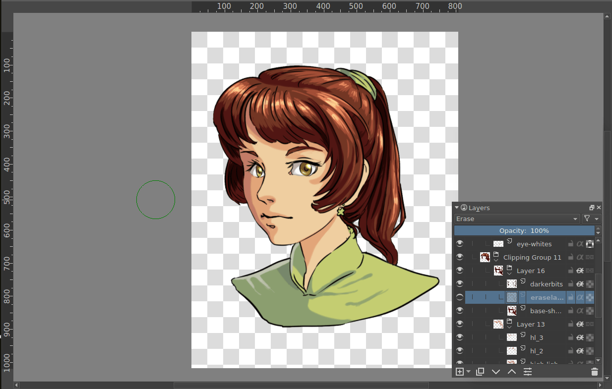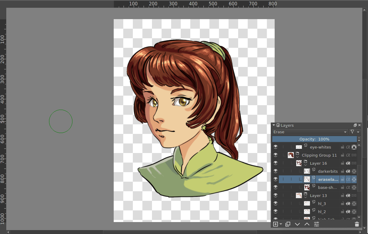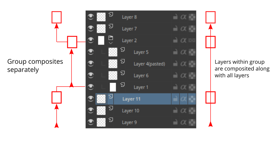 O Krita não possui a funcionalidade de máscara de recorte como o Photoshop e programas que imitam a funcionalidade do Photoshop. Isso ocorre porque, no Krita, ao contrário desses softwares, uma camada de grupo não é uma coleção arbitrária de camadas. Em vez disso, no Krita, as camadas de grupo são compostas separadamente do restante da pilha e, em seguida, o resultado é adicionado à pilha. Em outras palavras, no Krita, as camadas de grupo são, na verdade, imagens distintas dentro da sua imagem.