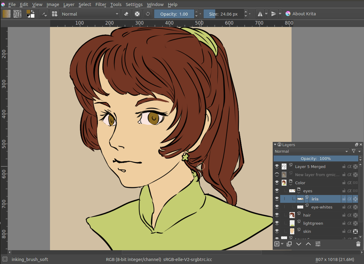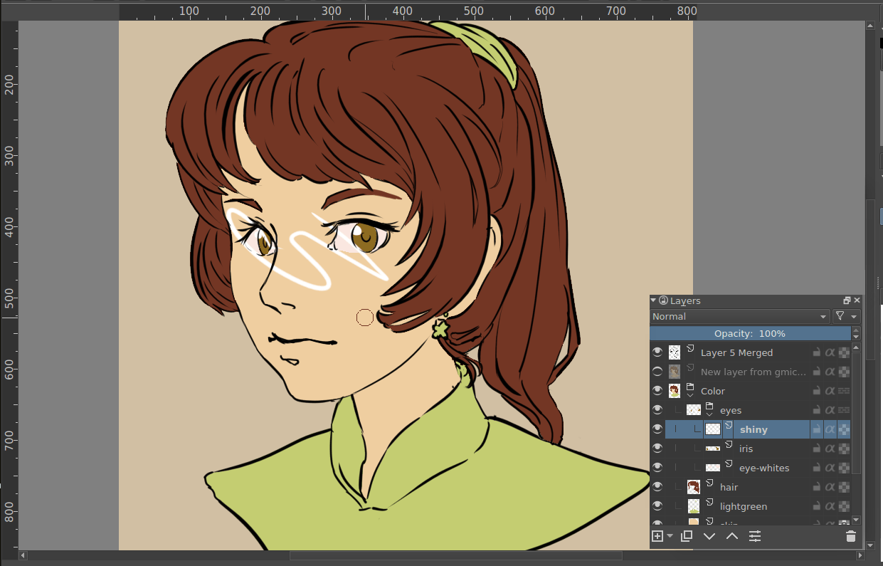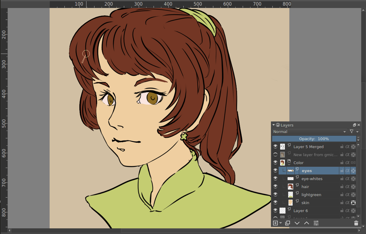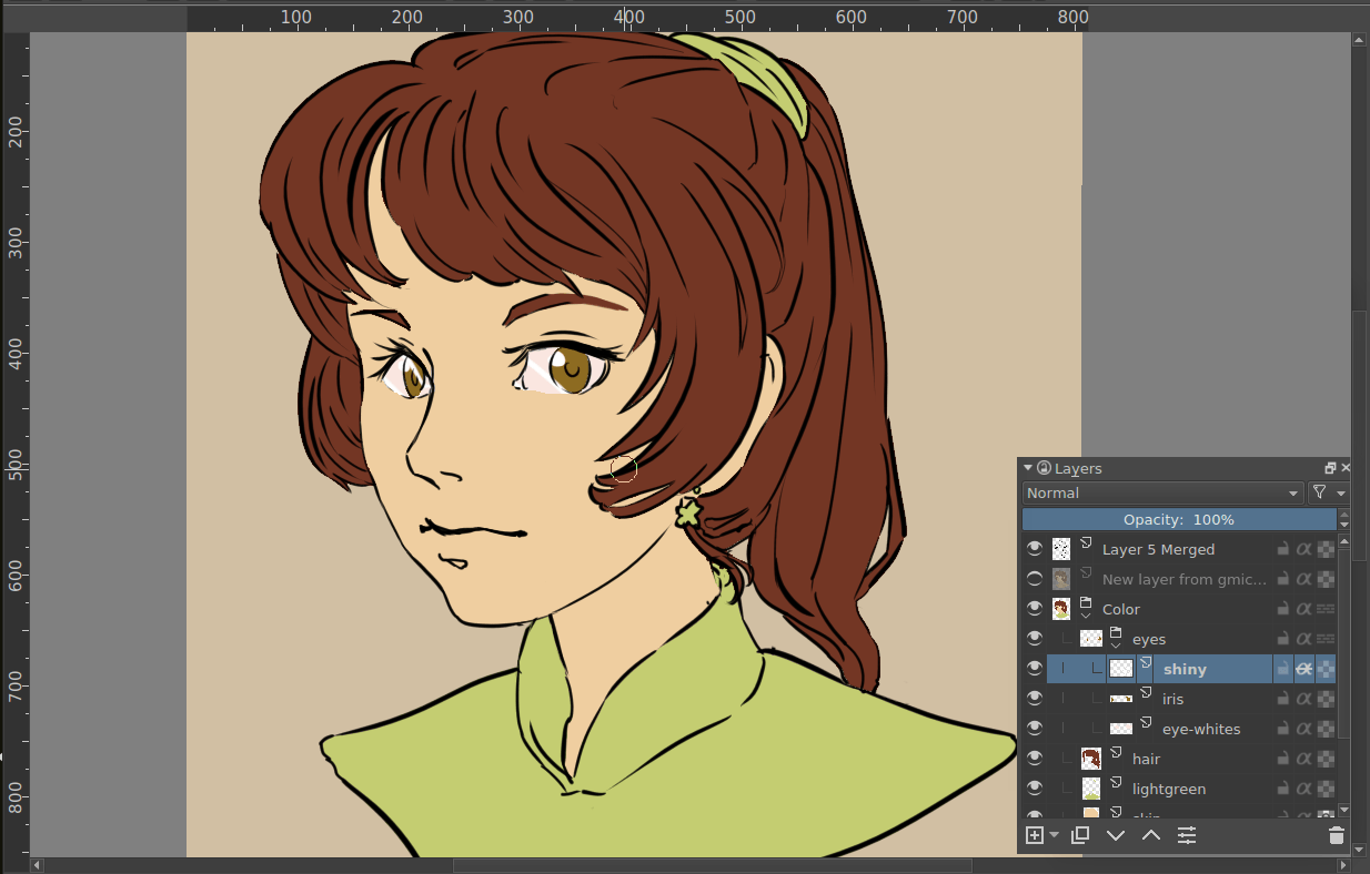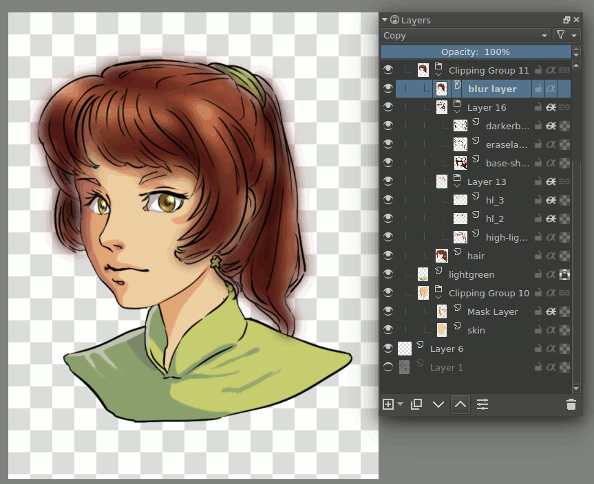 Aqui temos uma imagem com arte de linha e uma camada para cada camada de cores. Queremos adicionar um sombreamento complexo em várias camadas, mantendo a nitidez das camadas de cor existentes. Para que uma máscara de recorte funcione, primeiro você precisa agrupar as camadas. Você pode fazer isso criando uma camada de grupo e arrastando e soltando as camadas nela, ou selecionando as camadas que deseja agrupar e pressionando o atalho Ctrl + G. Aqui, fazemos isso com as camadas da íris e do branco dos olhos.