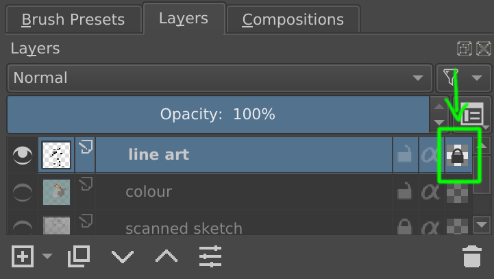 Isso converterá a cor branca da sua arte de linha em alfa, ou seja, tornará o branco transparente, deixando apenas a arte de linha. Sua arte de linha pode estar no espaço de cor em tons de cinza, um recurso exclusivo do Krita que permite manter uma camada em um espaço de cor independente da imagem.